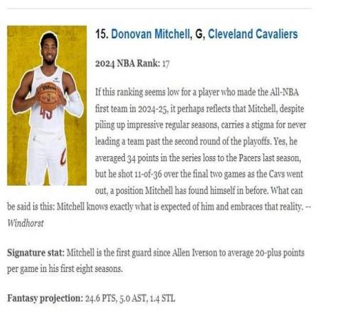 如果这排名对于一位2024-25赛季入选最佳阵容一阵的球员来说显得偏低,那根源就在于米切尔 —— 尽管他常年交出亮眼的常规赛数据表现,却始终戴着“从未率队突破季后赛次轮”的标签。上赛季对阵步行者的系列赛中,他场均轰下34分,但在骑士出局的最后两场比赛,他36投仅11中,米切尔并非首次经历这种局面。可以确信的是:米切尔完全清楚外界对他的期待,但也只能坦然接纳这一现实。