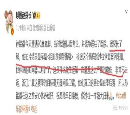 当然,真正糟糕的是,在比赛开场不久后,广厦的核心后卫孙铭徽便意外受伤。根据现场画面来看,孙铭徽是在一次突破中,误踩了迪亚洛的脚,意外崴脚。在谈到这一次崴脚时,孙铭徽毫不避讳的表示,这是他职业崴脚最严重的一次。随后,他被队友背着离开赛场。赛后,根据知情人士透露,孙铭徽这一次伤到了距腓前韧带撕裂,将会缺席接下来的比赛。而对于孙铭徽会缺席多久,根据该知情人士透露,孙铭徽此次伤停,恐怕会以月计。