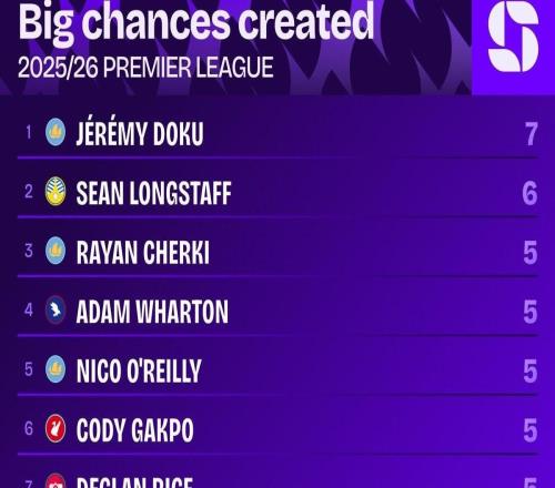 赛季至今英超创造绝佳机会榜:多库7次第1,加克波、赖斯上榜